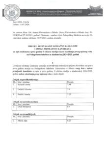 Odluke o usvajanju preliminarnih rang lista i spiskova primljenih kandidata za upis u prvi godinu I i II ciklusa studija u akademskoj 2024/2025. godini